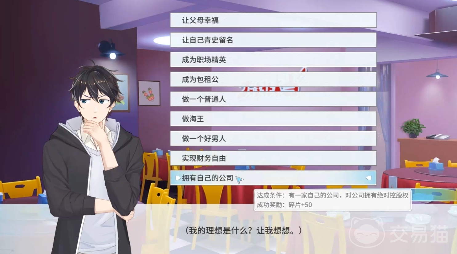 目前游戏内的理想一共分为9个,分别是让父母幸福,让自己青史留名,成为职场精英,成为包租公,做一个普通人,做海王,做一个好男人,实现财务自由,拥有自己的公司。这些理想对应的达成条件都是不一样的,相对而言,成功奖励也会有所差别,下面将分别介绍一下: