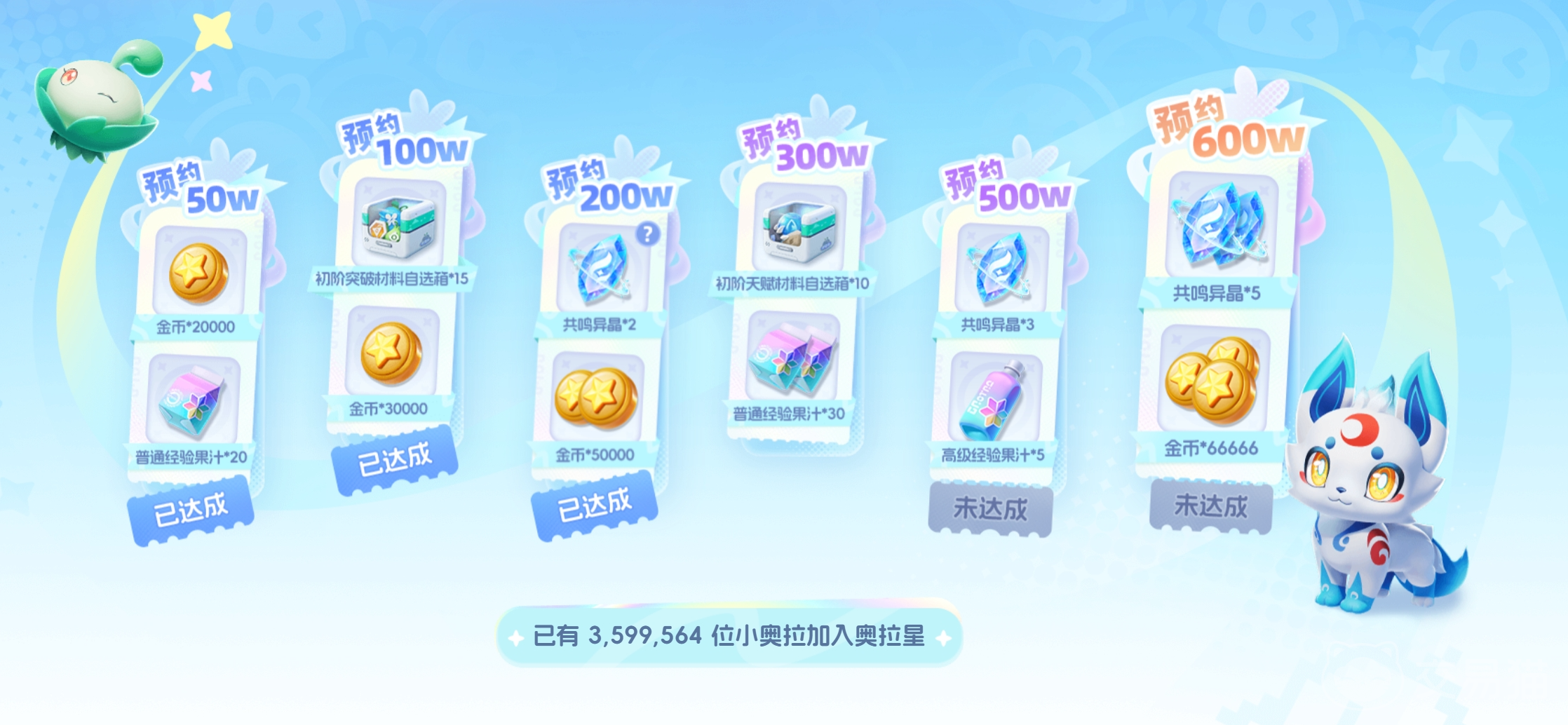 现在预约奥拉星2,官方还给出了丰厚的奖励,玩家可以根据《奥拉星2》的预约活动规则,当全平台预约人数达到一定的目标后,玩家可以解锁对应的预约福利。这些福利可能包括定制时装、经验果汁、金币等。因此,尽早预约并邀请好友一同参与,将有机会获得更多的奖励。