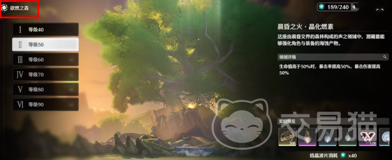 等待洞穴开学后就可以进入欲燃之森了游戏当中第一等级是40级,也就是说玩家达到40级之后就可以进入到他的挑战赛当中。目前游戏的挑战模式分为多人匹配和单人挑战赛,游戏当中一共有八种不同的奖励,每一次挑战过程需要消耗40个结晶拨片,在该领域当中生命值如果能够高于50%,那么暴击率可以提高50%,暴击伤害也可以提高50%,在关卡当中潜藏着大量可以使人物角色以及装备强化提升的素材资源,同样是一个非常值得挑战的副本任务。
