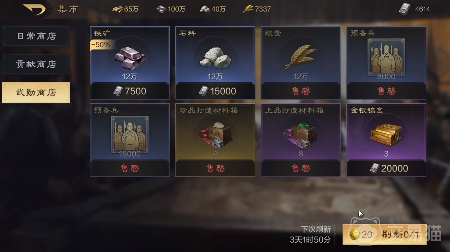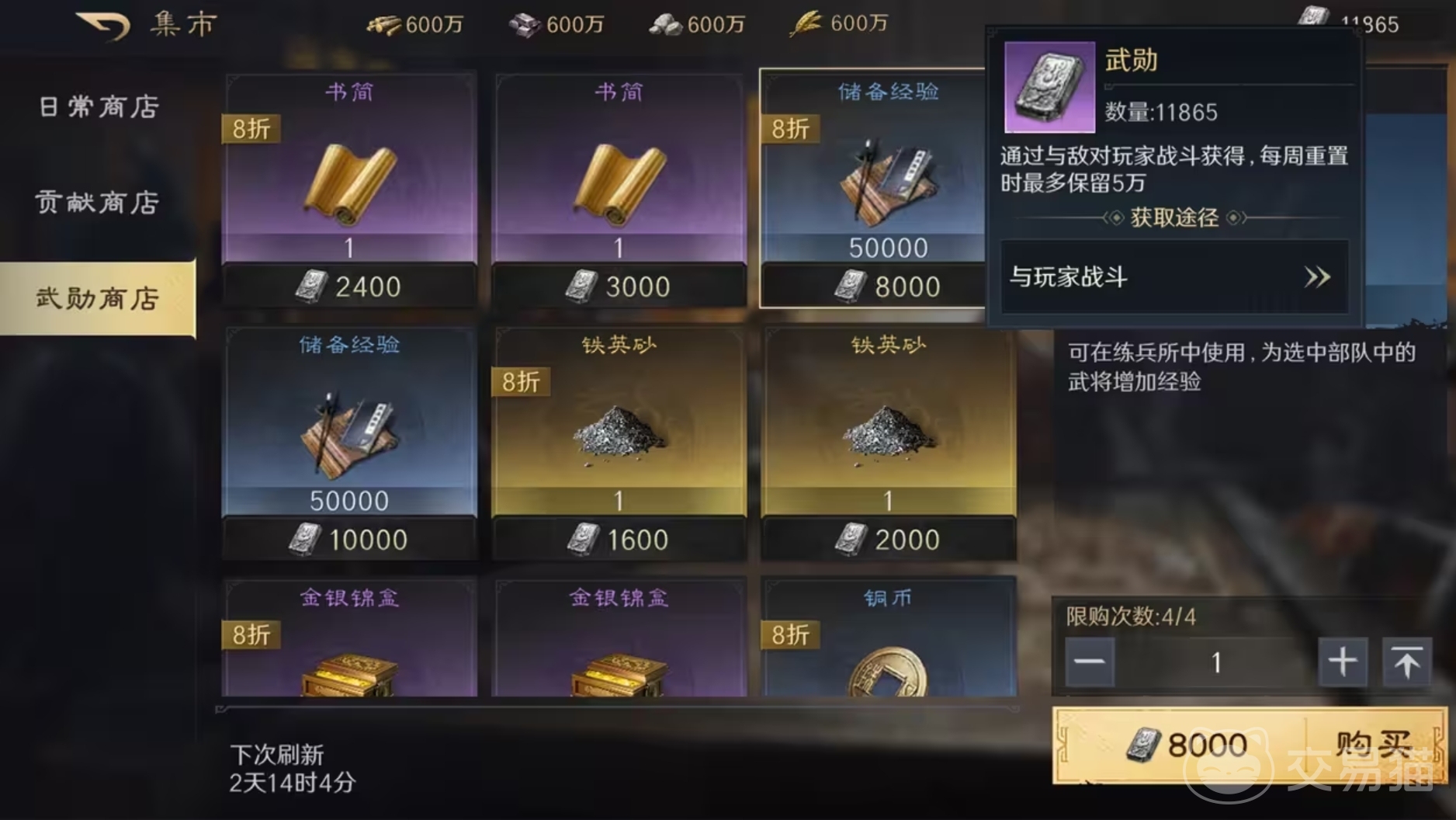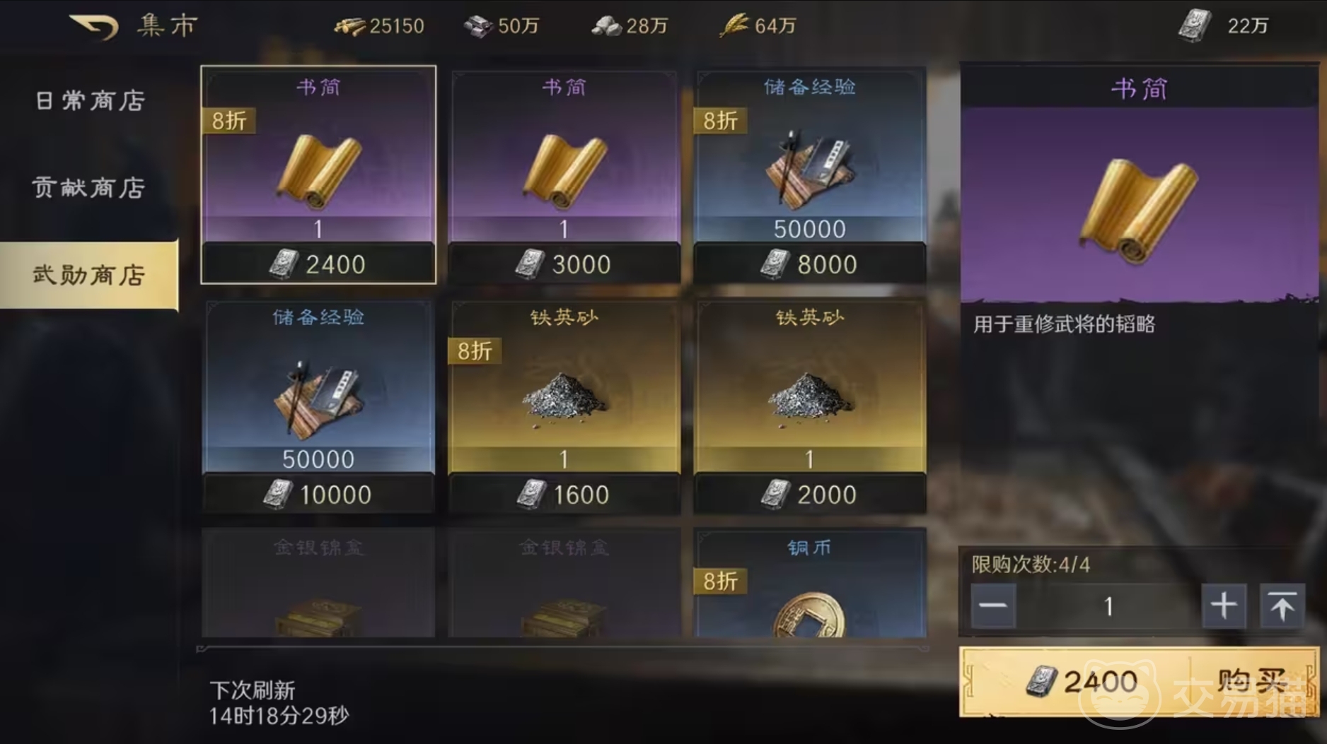 若玩家前期的武勋值不够多,无法将武勋商店搬空,那最好只买一些产出途径较少,或是消耗量比较大的资源,例如紫色的书卷,可让玩家快速补充兵力的预备兵等,要是玩家们比较缺铜钱或粮食来进行势力的发展,也可以提高铜钱和粮食的兑换优先级,保证自己的经营进度能跟得上他人。