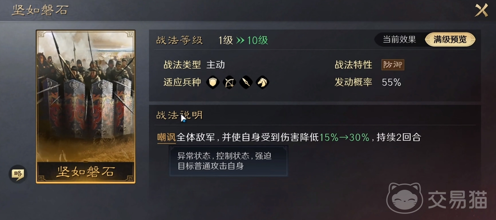 再加上该技能在命中后,敌方统率高于孙坚时会直接降低目标50%统率,低于孙坚时则会被施加震慑效果,实战中格外的好用,也使得战法武烈破虏是一个集伤害和施加负面效果为一体的战法,在实用型性方面可谓是直接拉满了。