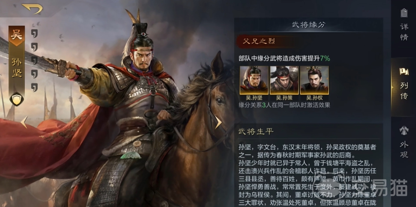 而在配队方面,可由孙坚孙策和孙权组成新的江东队,既能呈现出父子三人携手上阵的欢乐场面,在整体强度上也并不弱,还能触发父兄之烈的效果。此外,孙坚的战法搭配非常的灵活,基本上常用的前排战法都可用,例如横征暴敛、坚如磐石等。