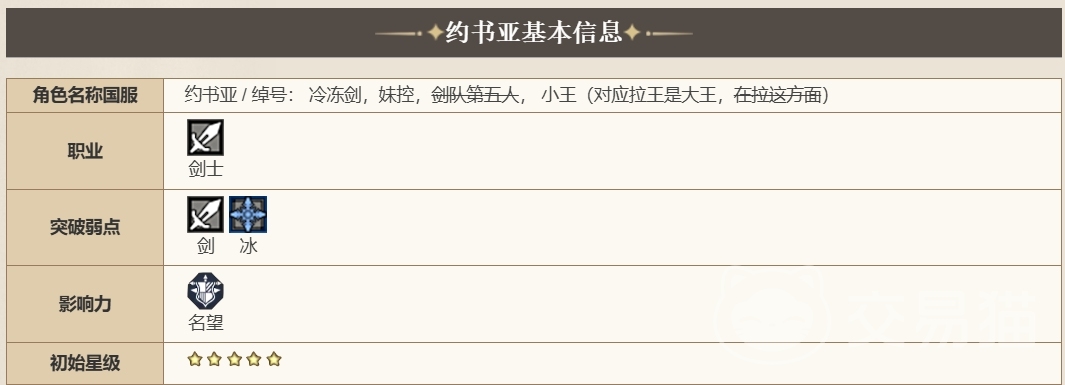 约书亚他的职业是一名剑士,突破弱点是剑和兵,他的被动技能一是战斗开始时,可以赋予自身速度,提升30%的效果,被动技能二在选择行动阶段开始时,有20%的概率发动两次使用的技能(1回合/不可延长回合/追加发动的次数不消耗SP),灯火技能可以赋予自身造成暴击10伤害,提升30%的效果。
