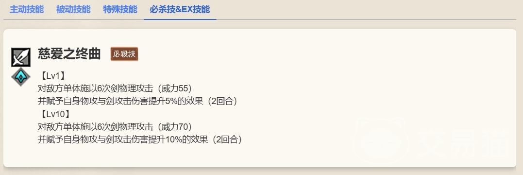 约书亚的必杀技是对敌方单体施以6次剑物理攻击(威力55),并赋予自身物攻与剑攻击伤害提升5%的效果(2回合),如果将必杀技升级到10级,可以将威力提升到70和伤害提升10%的效果。
