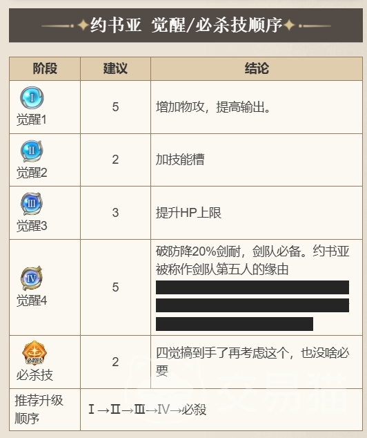 四级觉醒首饰物攻60,会心80,赋予剑攻击伤害提升10%的效果(装备性能带来的效果上限:30%),自己让敌人破防时,赋予破防中的敌人剑耐性下降20%的效果(3回合),推荐升级技能顺序I、II、III、必杀技。