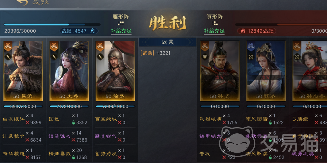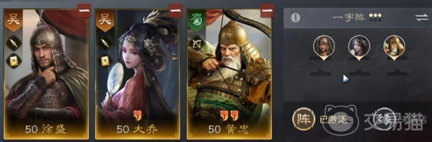 在战斗中这套阵容让徐盛泽前排抵挡伤害作为一个副c进行使用,大乔牵制敌人进行buff叠加保障后排黄忠的输出。在整体的战斗中,一肉一辅一输出,基本上属于比较均衡发展的队伍搭配,在游戏中兼顾了很多输出方面的伤害。