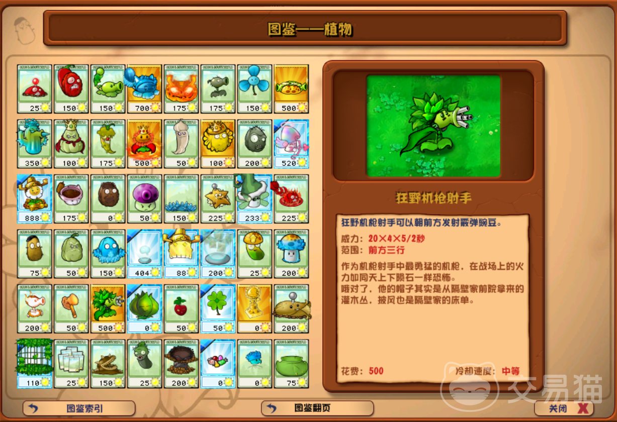 2、狂野机枪射手的攻击是群体的,20X4X5,相当于一次攻击可以打出400点伤害,而且攻击讲个事两秒,相较于豌豆大炮的四秒要强上太多了。再搭配火焰之后伤害更是有质的飞跃,无论放在前排还是后面都非常的好用。