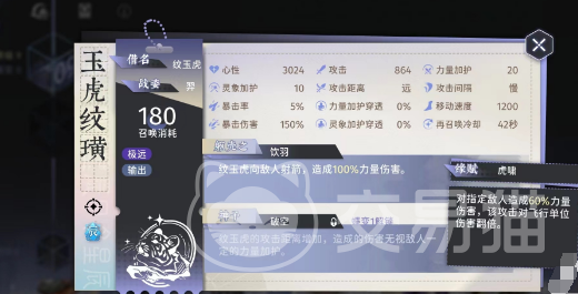 除了作为出战角色外,玉虎纹璜还可以作为支援角色出战。它的“缘赋虎啸”技能可以对指定敌人造成60%的力量属性伤害,如果攻击目标是飞行单位的话,伤害还会翻倍增加。这一技能对于飞行单位较多的敌人非常有效,能够帮助队伍快速清理这些棘手的敌人。即使不占用出战名额,玉虎纹璜也能发挥出相应的战斗作用,对于需要针对飞行单位进行战斗的关卡来说,它是一个非常不错的补充选择,通关概率很是带劲。非飞行单位的敌人,使用后续技能也能解决问题。