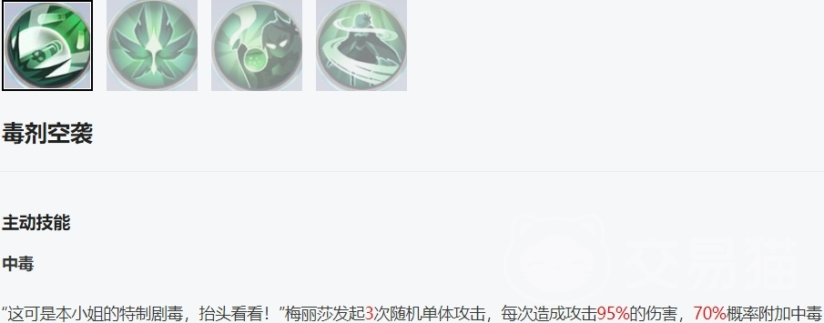 毒剂空袭这个技能挺有意思的,它随机选三个目标进行攻击,有可能同一个目标会被选中好几次。不过,好在每次攻击让目标中毒的机会都是分开的,第一个目标没中毒,不代表后面两个也一定不会中毒。而且,这个技能得用上一万能的魔晶才能发动,这样一来,梅丽莎就成了剧毒队伍里最能稳定加buff的角色了。