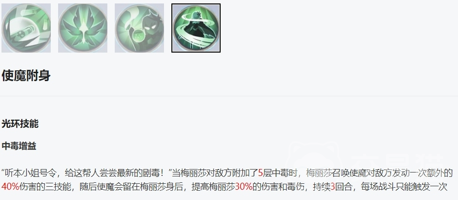 猛毒使魔这个技能真的很实用,它能让梅丽莎造成的附加伤害更高,这样一来,梅丽莎就成了剧毒队伍里的重要角色。这个技能的加成效果对所有持续性的伤害都有效,而且只要敌人被这个技能标记了,引爆中毒效果时也会变得更强。