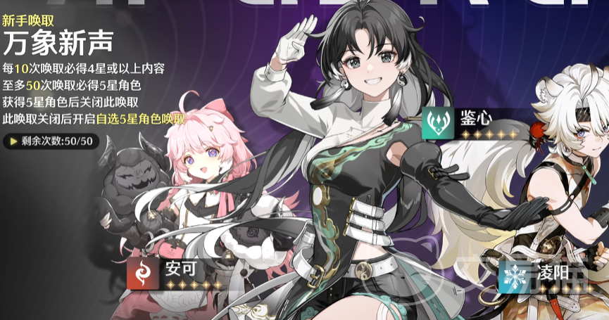 大家进入游戏且过了序章后,抽卡功能就会开启,在开启后就代表游戏正式开始了,大家就需要开始着手配队了,而配队就需要对应的角色,需要大家去抽能配队的角色,而在新手池中需要抽的角色是有不少的。首先是第一个新手池50抽的新手池,这个池子中在抽到第50发之后会抽到一个随机的五星角色,这个五星角色会是大家抽到的第一个角色。