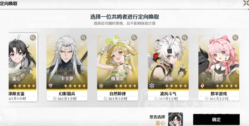 之后就轮到最后一个新手池了,这个新手池就是上面提到的自选五星兑换池,这个池子中大家可以用兑换卷直接兑换一位五星角色,在这位可兑换的五星上,如果大家前面已经抽到一位辅助和一位主c角色的话,这里建议大家是补鉴心凑出一套完美阵容,如果大家前面两个池子只拿到一位主c或者是一位辅助的话,那就按是主c还是辅助补主,或是辅助凑阵容就行,就没必要选鉴心了。