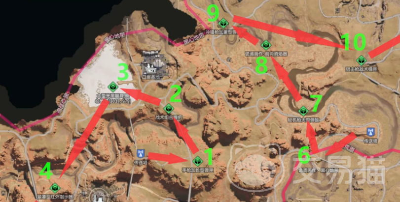 首先我们先来看看黑心地带的这张地图,从图中可以看出,这里一共有十个重要的配件需要我们收集。当然在此之前,我们需要准备一些小工具,比如燃烧瓶和手雷,它们会在后续的探险中起到关键作用。我们先从一号配件开始说起吧。这个配件是手枪弹夹,位置很显眼,我们只需要按照地图上的指示传送过去,然后走过一道蓝色的门就能轻松拿到。接下来是二号配件,战术组合握把。这个配件的获取稍微有些小技巧,我们需要过桥去取,但在过桥的过程中,要注意天空中漂浮的气球。不过别担心,只需要简单打三次,就能继续前进。