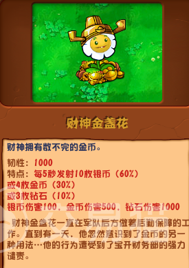 其中银币的伤害力为100点,金币的伤害力高达500点,而钻石更是能造成惊人的1000点伤害。这样的攻击能力,足以让任何僵尸都望而生畏。同时财神金盏花的韧性也非常高,达到了1000点。这意味着它非常耐打,能够在战场上持续为玩家提供火力支援。而且,它的攻击范围是全屏的,无论玩家的僵尸从哪个方向来袭,它都能轻松应对。种植财神金盏花只需要888点阳光,这在游戏中并不算太高。而且它的冷却速度也还可以,让玩家能够更快地再次种植它。这样的特点使得财神金盏花成为了一位非常实用的植物,无论是在防御还是攻击方面都有着出色的表现。