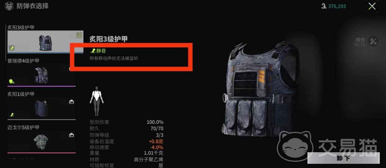 在护甲方面的话,建议大家选用三级的炽阳甲。炽阳系列的装备能够消除你的脚步声,也就是所谓的静音装备。这样能够让你更安全的移动,并且价格也不高,在游戏中也能够轻松的在人机中找到这些装备。