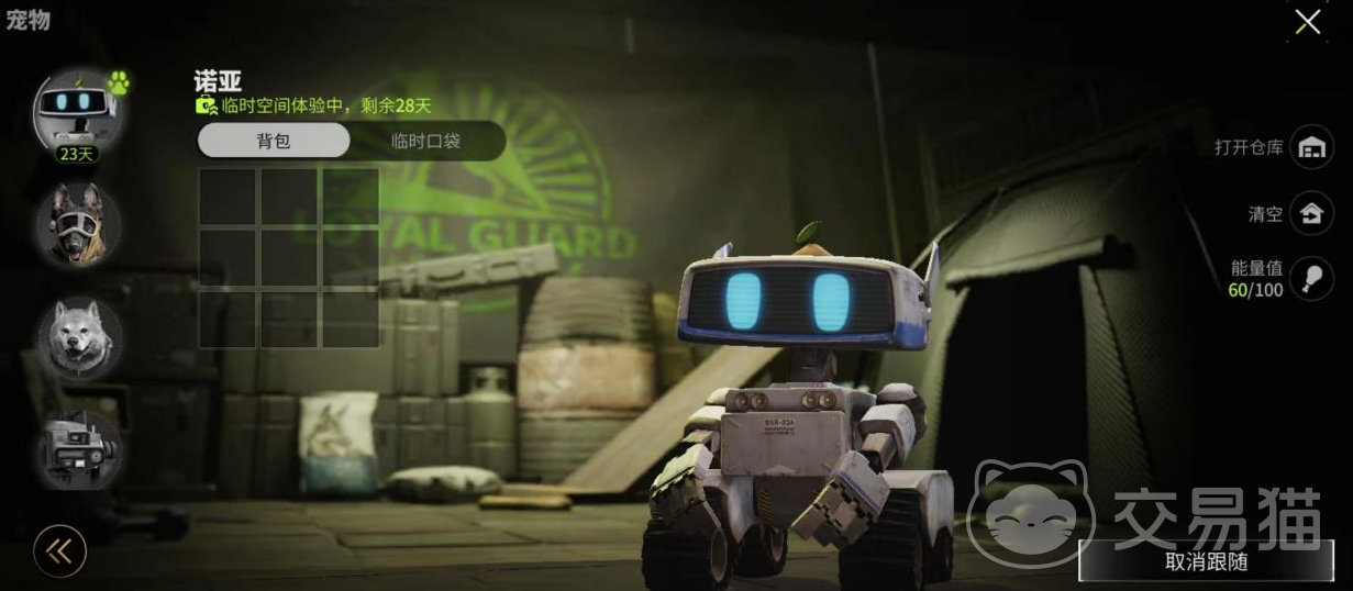 在装备选择上有以下几点还需要注意,宠物推荐大家需要佩戴一个能够带有背包效果的宠物。这样就可以将捡到的物品全部放在保险箱里面,不至于被消灭之后又全部掉落。这里推荐选择使用背包第二大的诺亚,该宠物价格较低,通过新手活动就能体验30天。