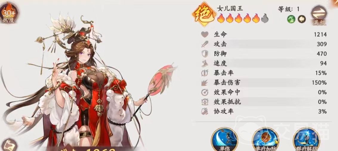 而女儿国王拥有强大的群体治疗能力,不仅能够给队友恢复生命值还能解除队友的弱化效果。非常推荐在单核阵容时选择,具有单体较高的回血与群体回血,还能提高自身速度,最后提高团队的总体实力。