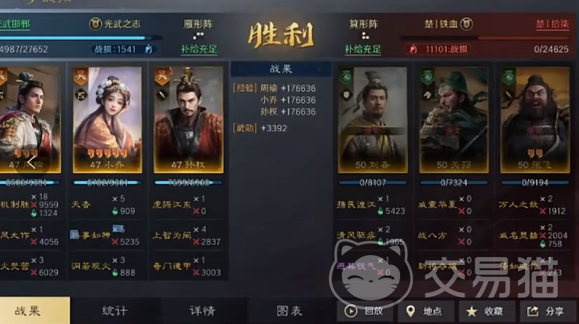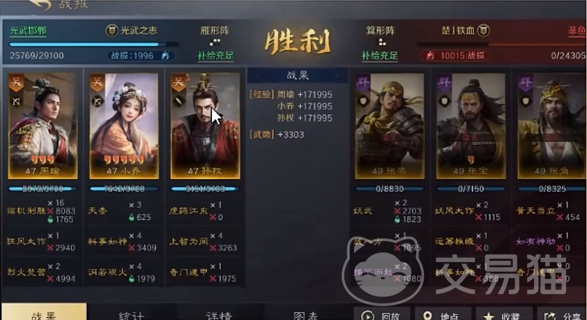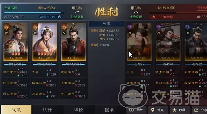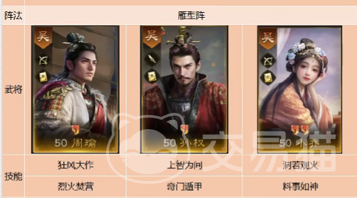 这套阵容主要的输出是周瑜和小乔,周瑜和小乔的羁绊在搭配上孙权能够提高整体队伍的主动战法的发动的概率率,提高输出条件以及输出效果,并且小乔的虚弱能够抵御80%的减伤,持续战斗结束不断的为对面敌人挂上虚弱的小bug,再发动攻击和胜利率非常大。