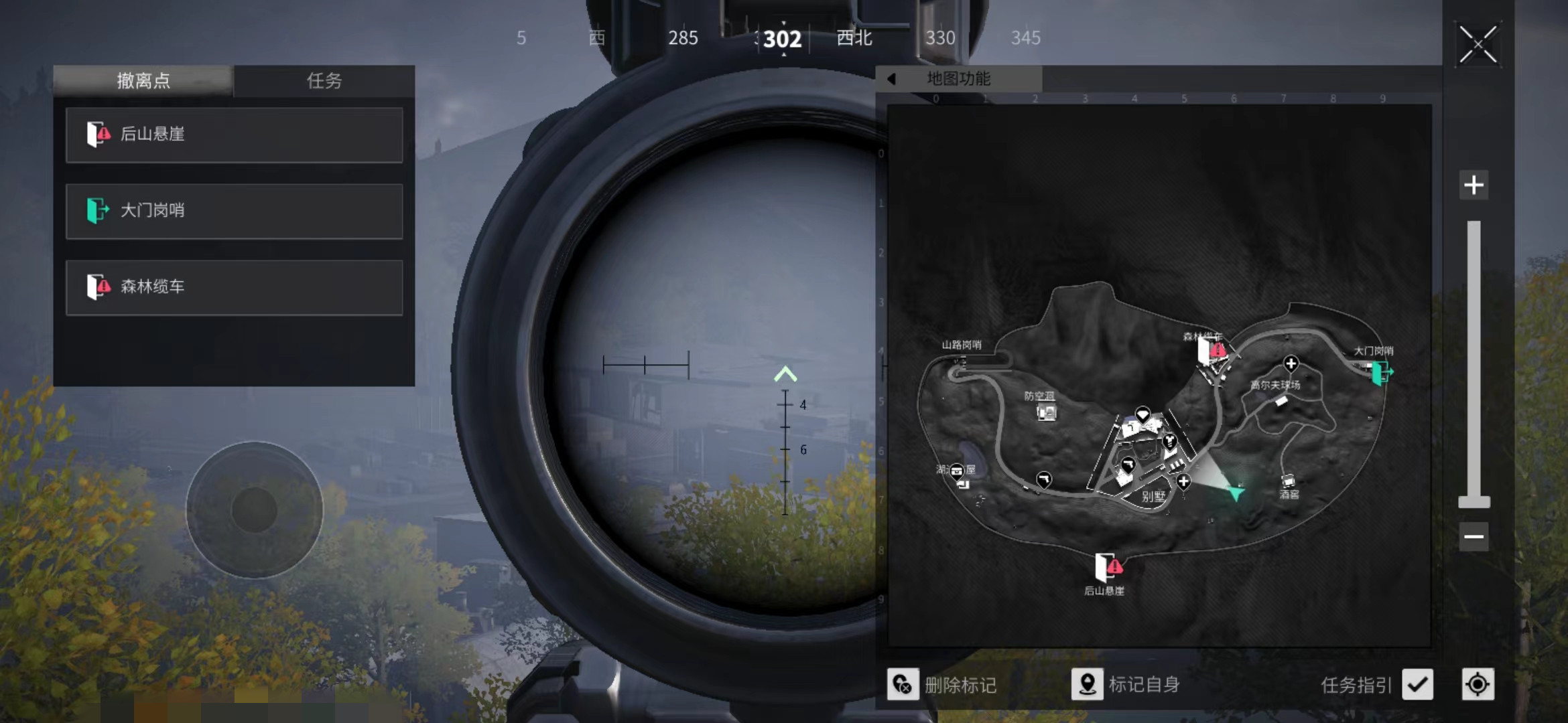 还有一个更好的点位,在别墅旁边缆车和别墅交界山顶上,这个位置可以直接看到整个别墅侧面,居高临下有着极强的优势,对方只要出现几乎很难逃脱狙击手的射击。在大门岗哨和球场中间山坡上,也是一个好位置,这里可以有效攻击高尔夫球场中其他玩家,无论是萤火虫还是游荡者都难逃狙击。顺着路往山上走,来到球场和缆车交接山坡上,在这个山坡上埋伏下来,可以很清楚地看到球场室内以及缆车撤离点,视线方面没有任何阻碍,可以轻松开枪。