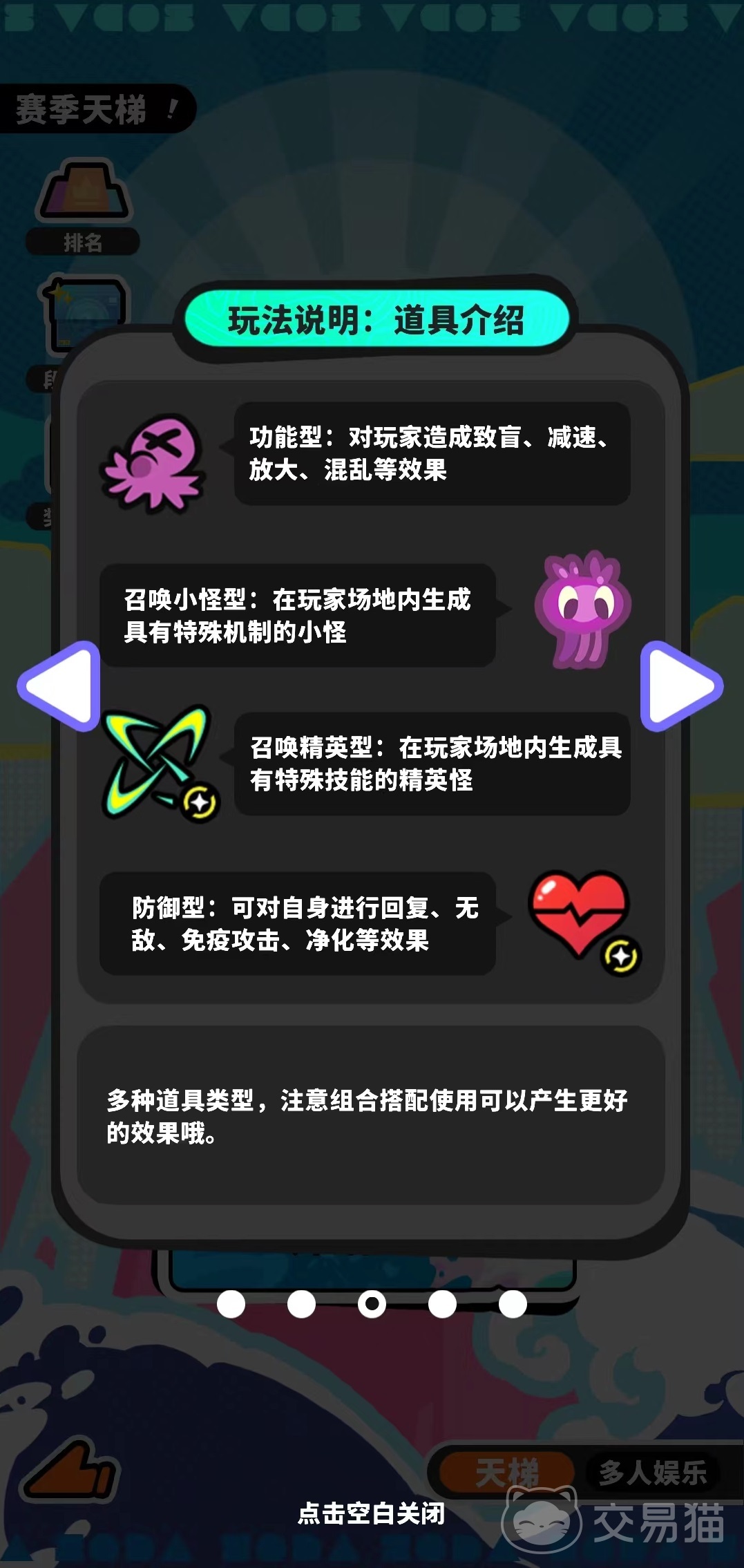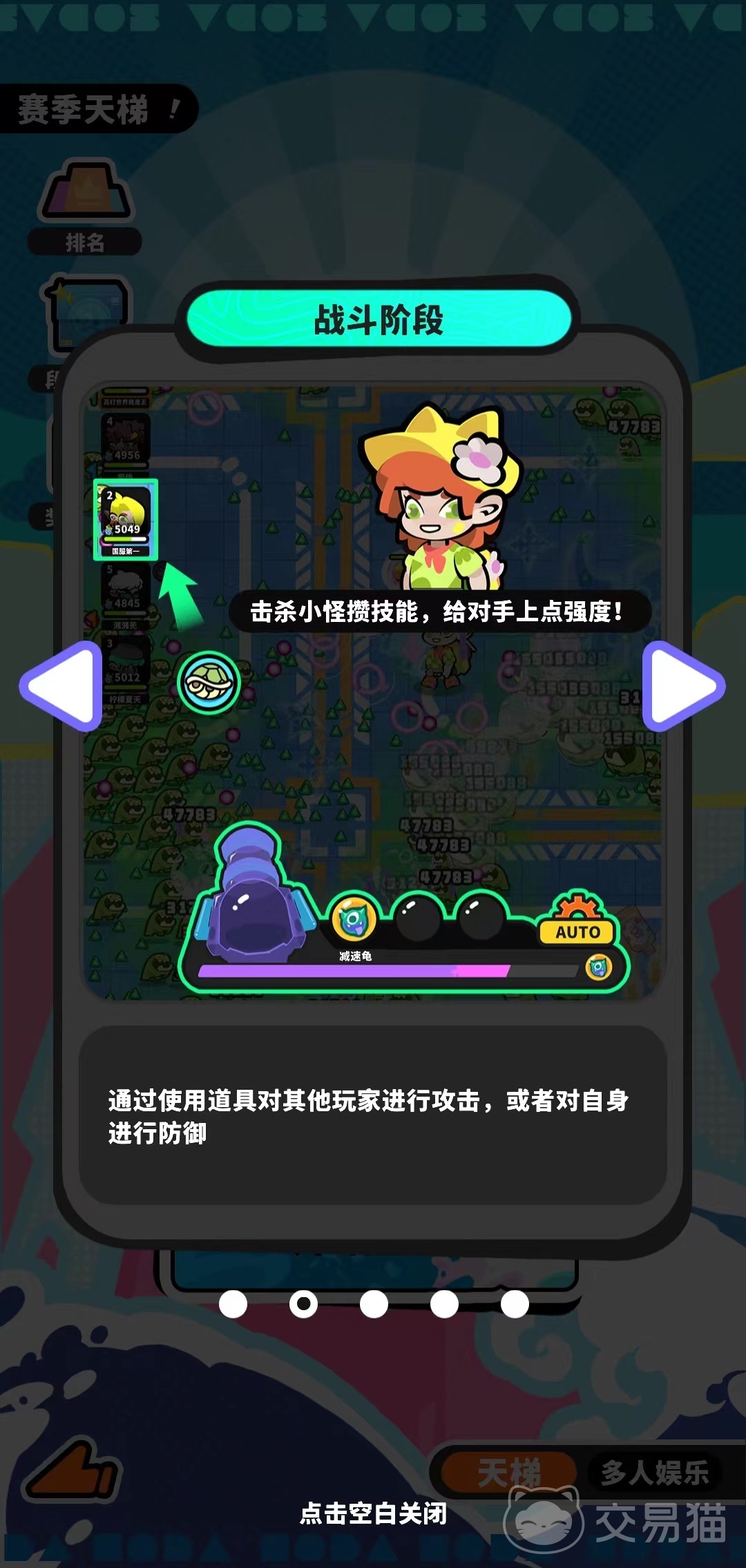 防御型则是对自己进行释放,包括恢复,无敌,免疫攻击和净化等。多种道具类型必须注意组合搭配才能产生更好的效果。最后就是要注意比赛规则,对局结束前根据被淘汰的先后顺序进行排名,如果在结束之后拥有玩家存活,则根据击杀的积分来进行排名。
