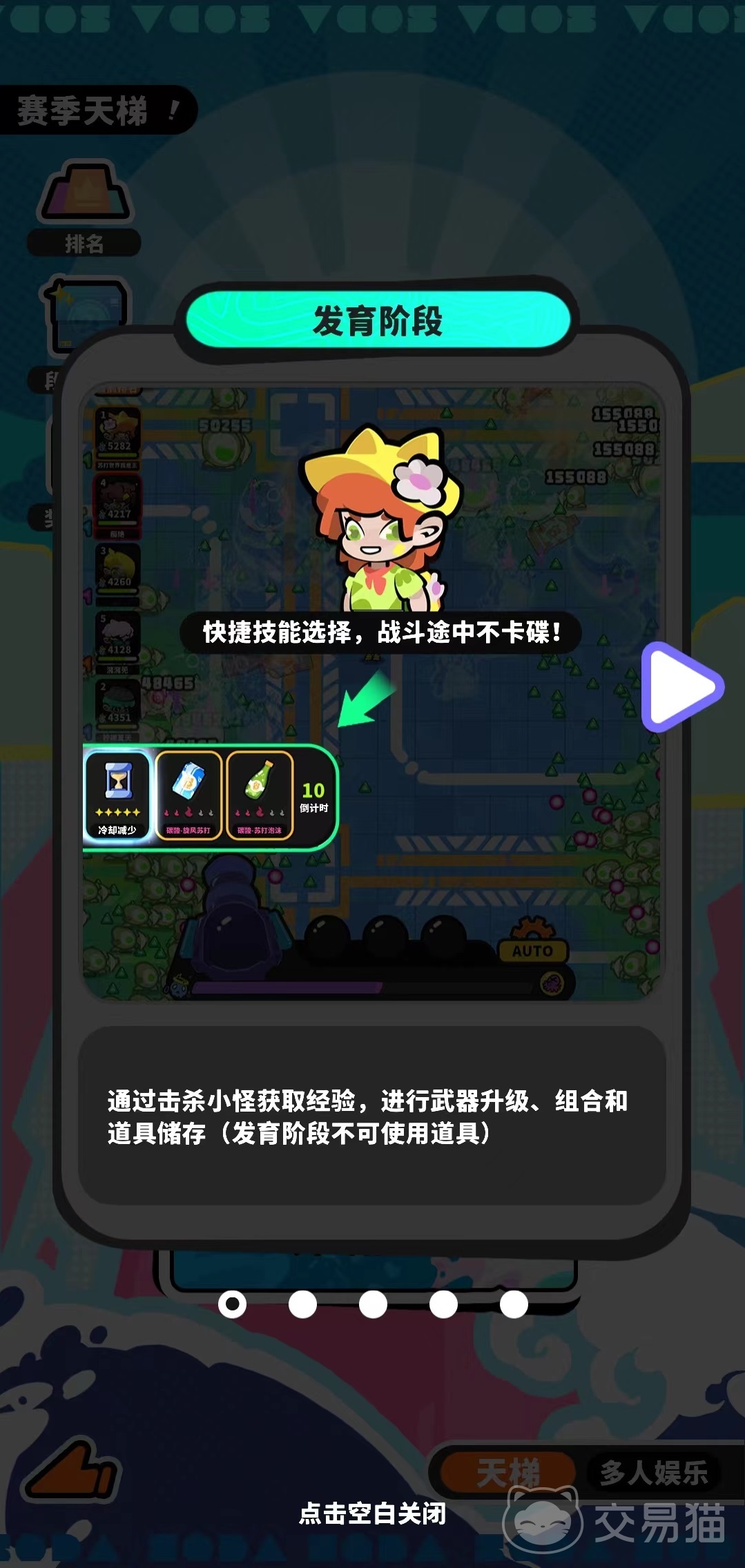 挑战之前需要先看一下当前天梯词条,词条属性对于玩家清理小怪非常重要,以小编现在所处时间段为例,两个词条分别是加速和自带毒圈。这也就意味着所有小怪移动速度都会加快,所有小怪都会散发毒圈,根据词条妥善选择所使用的装备才能够过关。在天梯战斗具体过程中,首先是发育阶段,可以选择快捷技能,战斗途中不会卡顿,这一段时期通过击杀小怪来获取经验,进行武器升级、组合与道具储存,要注意的是在发育阶段不可使用道具。