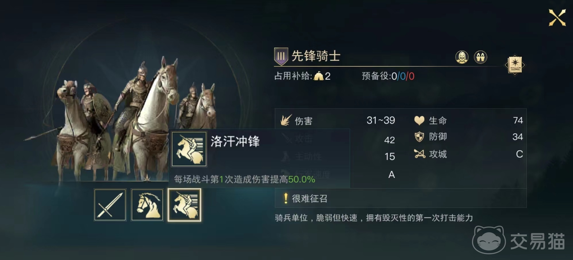 整个搭配都是选择强大的骑兵作为兵种,出现的都是先锋骑士,先锋骑士本身很难征召,作为骑兵单位,脆弱但有极快的速度,拥有毁灭性的第1次打击能力。只有最具天赋的洛汗骑手才能成为先锋骑士,成型之后战力可选一般。具有洛汉冲锋,骑乘,近战攻击等特点,其中洛汉冲锋能够在每场战斗的第1次造成额外伤害。