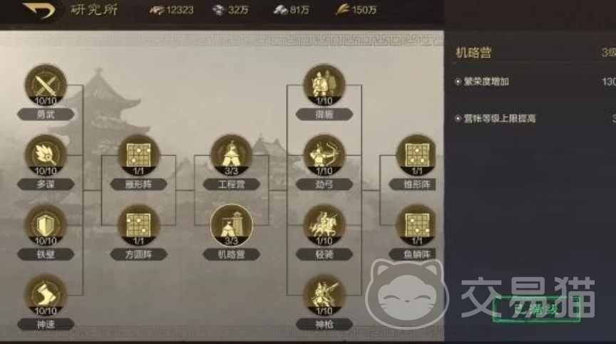 “研究所”是一个至关重要的建筑,能够提升武将的属性、伤害和抗性,这些升级都需要大量的木材、铁矿和石料,在与敌方正式开战之前或在粮食和兵力充足的情况下,应优先升级研究所,确保所有基础属性全部点满。毕竟,拥有强大的武将属性才能在战场上占据优势。升级研究所时,应根据自己的主力队伍兵种来决定升级顺序。例如,如果主力队伍是步兵,那么升级与步兵相关的科技就尤为重要。营帐的升级也不能忽略,尽管花费的资源不多,但其增强部队能力的效果非常明显。