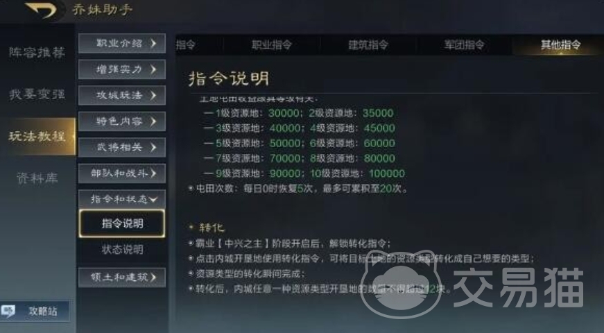在战斗中,兵力和粮食是最关键的资源,这两个因素直接决定了部队在前线的持久性和战斗力。进入中兴之主阶段后,司隶关口不仅被开放,还引入了一个新的玩法:内城资源地转化功能。内城资源地转化,顾名思义,即将内城的资源地转化为其他资源类型,比如将石头地转化为粮食地。要实现这一操作,只需点击资源地,就能看到“转化”指令。不过,一种资源地的数量不能超过12块,唯独司仓可以通过特殊技能,让指定资源地数量上限增加至16块。因此,在考虑后期资源分配时,司仓的这一技能应被优先考虑。