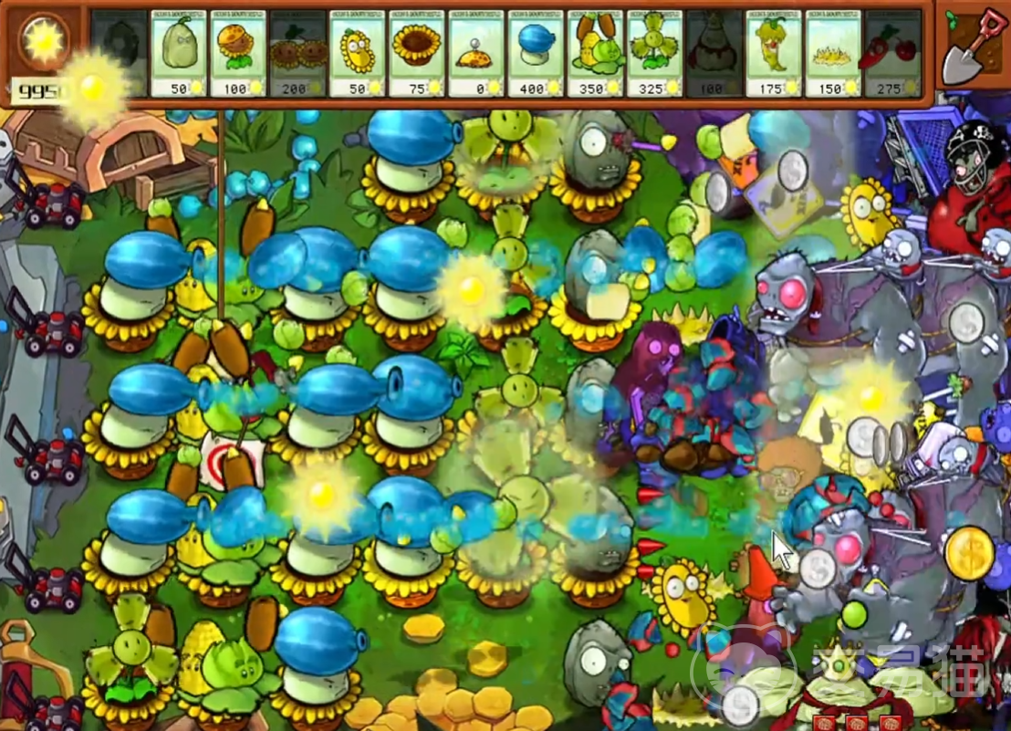 这把的主力是巨人僵尸以及舞王僵尸。中间四格全种上蘑菇向日葵,把阳光收益达到最大化。而攻击类植物,例如寒冰射手猫尾草,冰瓜猫尾草等,可以攻击到其他排的僵尸,这样前期过渡。