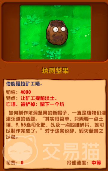 坑洞坚果可以说是“贫民窟”玩家的最好伙伴,零阳光就可以快速使用,而且它的冷却速度也达到了中等,目前它主要应对的是矿工僵尸,他通过它的美味可以拖延矿工僵尸的进攻时间,而且能够让矿工提前出土,从而为玩家获得更多的攻击时间,在这王后可以留下类似于毁灭菇的空坑洞,不过他对其他僵尸的影响力并不是那么大,但也是防御塔组合当中必不可少的一个角色。