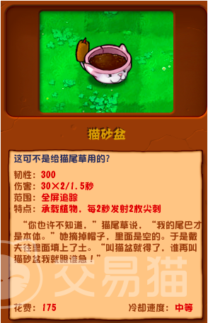 接下来的一个塔防就是猫砂盆,这个猫砂盆需要花费175个阳光,冷却速度属于中等,目前也可以实现全屏追踪,它的最大特点是可以承载植物,每两秒就可以发射两枚尖刺,韧性值也是高达300,而且在游戏当中尾巴才是它的本体,它就是从尾巴上发出超能尖刺的。