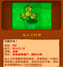 其实想要做刀妹的话所需要的基础塔防装置十分简单,玩家第一个要准备的就是仙人三叶草,仙人三叶草是游戏当中比较容易获得的一款植物,它的绝招就是万箭齐发,他能够在全屏范围内开启疯狂射击模式,吹退全屏僵尸,释放强有力的尖刺,其韧性值高达300,玩家需要花费125个阳光。