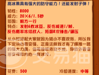 高冰果这个防御塔基本的技能属性还是非常明显的,每一个防御装置可以发射六枚冰豆,然后对敌人进行反伤和冻结,反伤可减速一针,并且它可以抵御八次来自僵尸的锤击或者是碾压,而每次使用该防御时会浪费500阳光,所以玩家在相对应的阳光规定范围之内,需要通过一定的策略搭配才能成功通关。