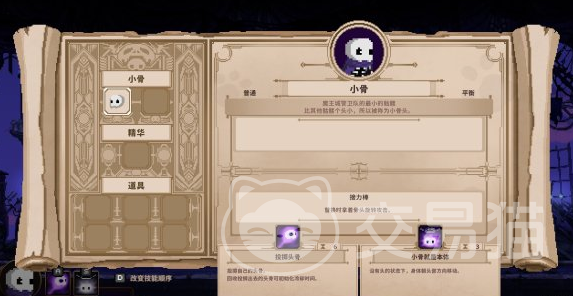 在获得头骨之后只需要按压↑键,玩家可以随意的切换技能或者是攻击方式。点击Tab键玩家还能看到在小骨的下方有对应的槽位,这里就是放头骨的位置,玩家可以选择用新头骨放入到其中,达到替换的效果。
