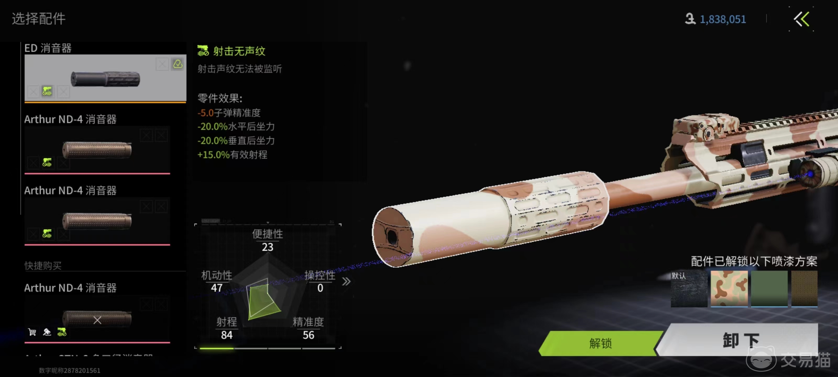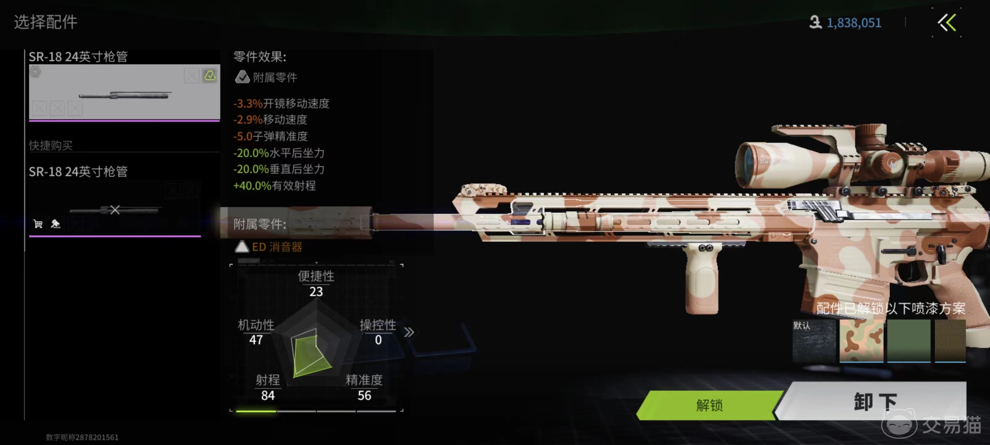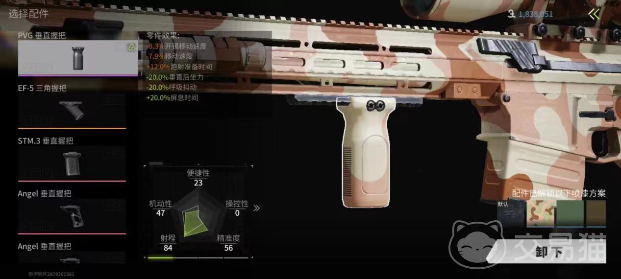 首先是枪口方面选择,ed消音器,该配件可以增加15%有效射程,增强远程打击能力,另一方面开枪后可以消除声纹,满足隐蔽性需求。枪管并没有太多的选择,24英寸枪管是必备选项,增加高达40%的射程,使这把枪实现超远距离打击。护木选择红色的导轨护手,这是为了优化呼吸抖动和屏息时间,对子弹精准度方面都有着较大的提升,符合这把枪械改装的要求。前握把可以放弃金色和红色,选择紫色PVG垂直握把,带来的20%呼吸抖动和屏息时间,是握把中该属性最好的一个,虽然会降低灵活性,但是对主打超远距离狙击的枪械来说没有任何影响。