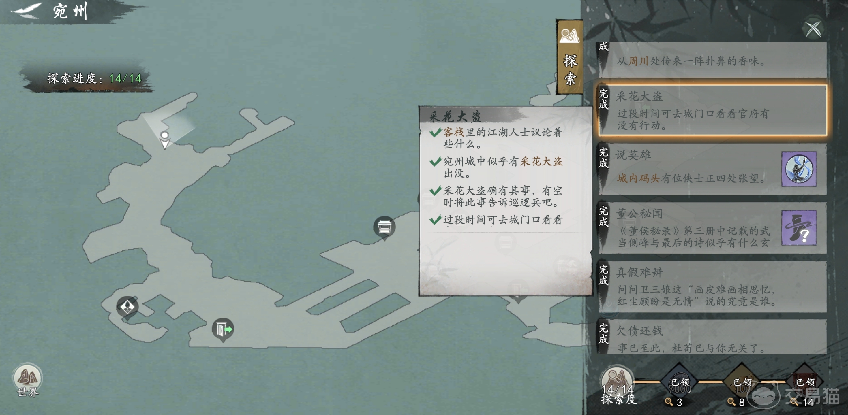 那么有关墨剑江湖采花大盗怎么打小编先说这么多,文中还给出了宛州城其他任务的过关流程,任务没有多复杂,只是玩家不清楚触发点和时间,不过接下来按照小编的攻略,就不会卡关啦!