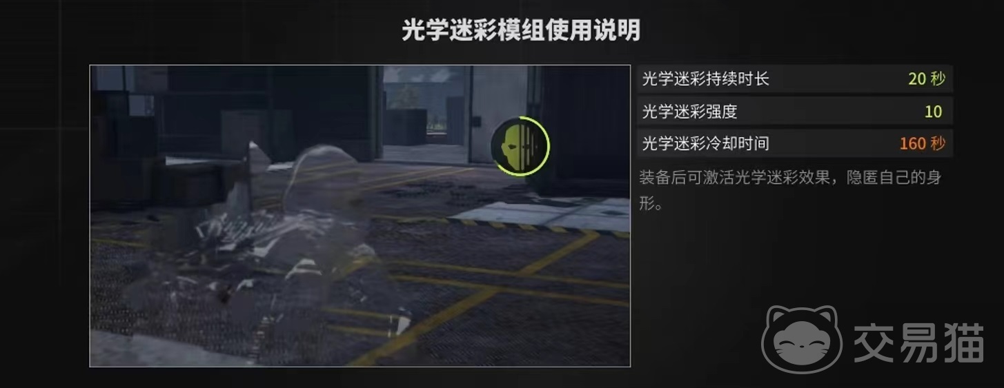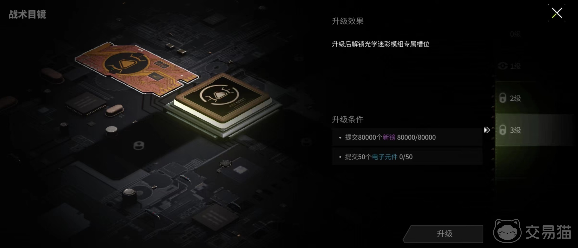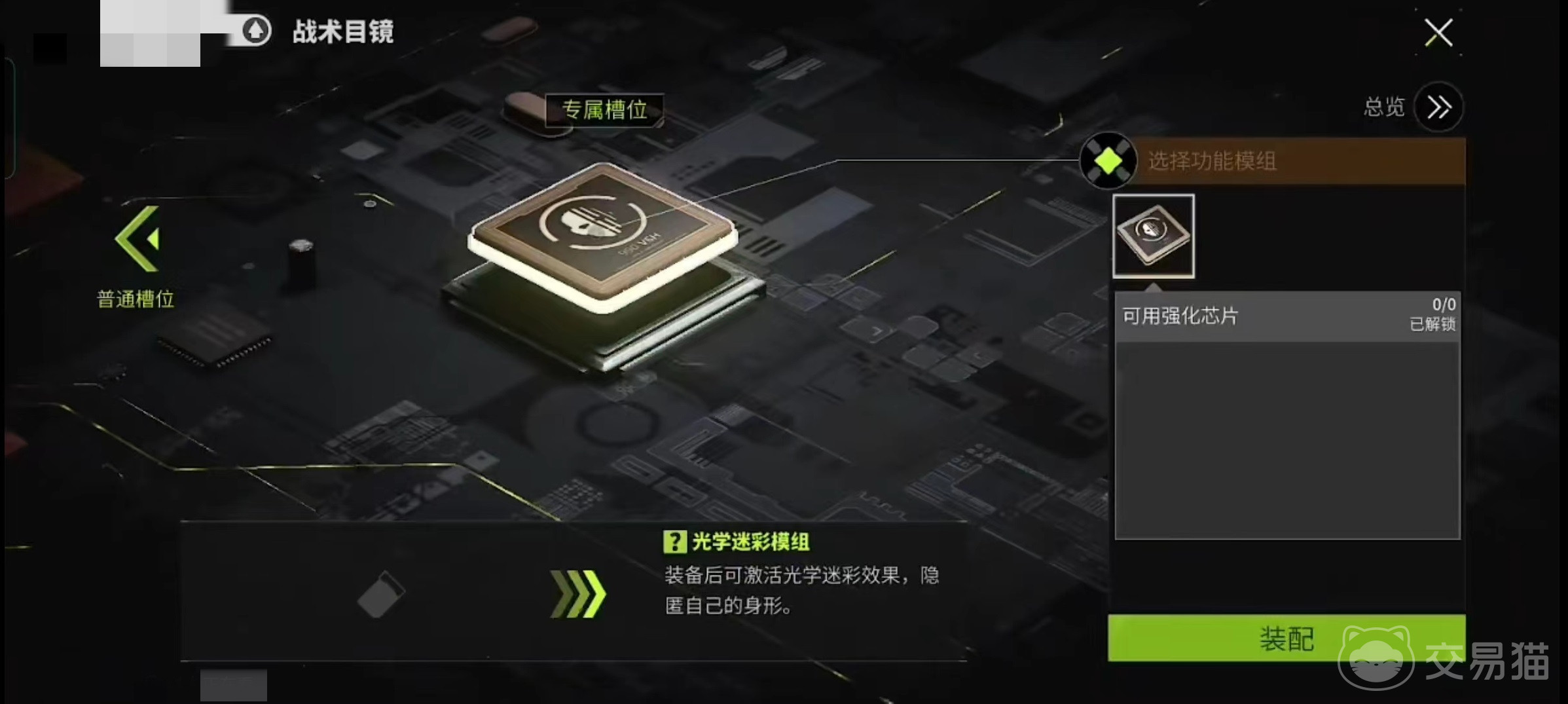 要想使用隐身功能,需要大家先将战术目镜升到满级,这样在之前三个模组基础上又多了一个新模组,就是今天要介绍的隐身功能。升级需要大量道具,尤其是50个电子元件比较难凑齐,在升级完成后就会解锁光学迷彩模组专属槽位了。因为没有出现升级提醒,所以很多玩家忽略了这一方面,至于芯片方面和其他几个槽位都是共享的。
