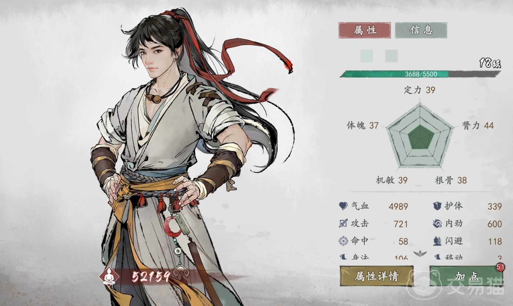 不同流派加点侧重点也不一样,刀剑加臂力,棍/拳掌加体魄,部分内劲功法加定力(招式描述中带内劲二字,则需要加定力)。在起步阶段完全不用加机敏,到后期再说。一次升级3点,分配建议为: