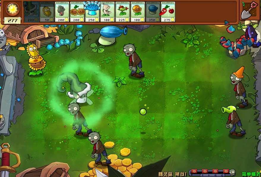 精灵菇是难度较高的挑战玩法,它仅锁定了精灵菇这一种植物,其它上场植物需要玩家自行选取,且该模式下玩家能使用的植物种类仅有十种。再加上该玩法种僵尸出现得比较早,数量又非常的多,所以玩起来还是有一定挑战难度的。