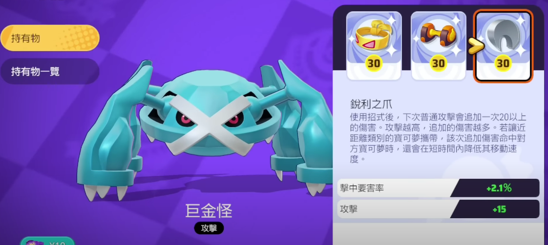 巨金怪的唯一缺陷就是前期的能力较差,并且在五级之前并不具备反打的能力,如果前期被敌人针对那么就比较难以发展起来,所以前期的巨金怪一般以保护自身的存活为主,尽量携带逃脱键位来帮助和敌人拉开距离,不仅如此,还可以携带气势头带、博学眼镜等buff增益道具。