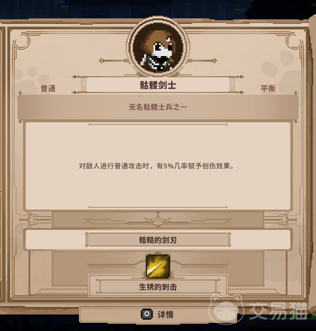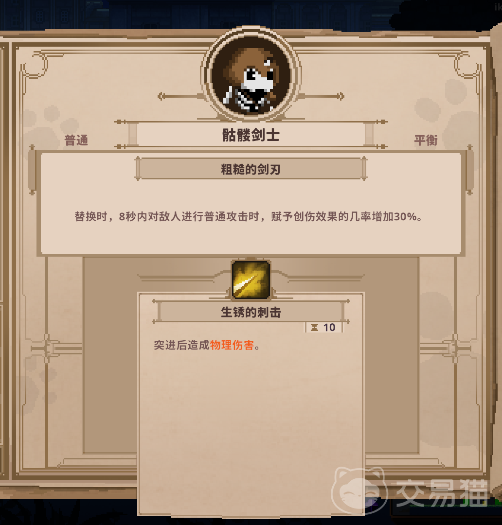 首先顾名思义,骷髅剑士的攻击方式自然是使用剑术,打出的伤害也是剑伤,属于近战型角色。骷髅剑士的普攻叫做粗糙的剑刃,对敌人进行普通攻击时会有一定几率触发创伤效果,相当于自带一个小范围扣血的debuff。而生锈的刺击可以让骷髅剑士向前突刺一段距离,同时造成伤害,很适合对敌人发起突袭的时候使用,并且在躲避敌人技能的时候也可以用来快速改变位置。