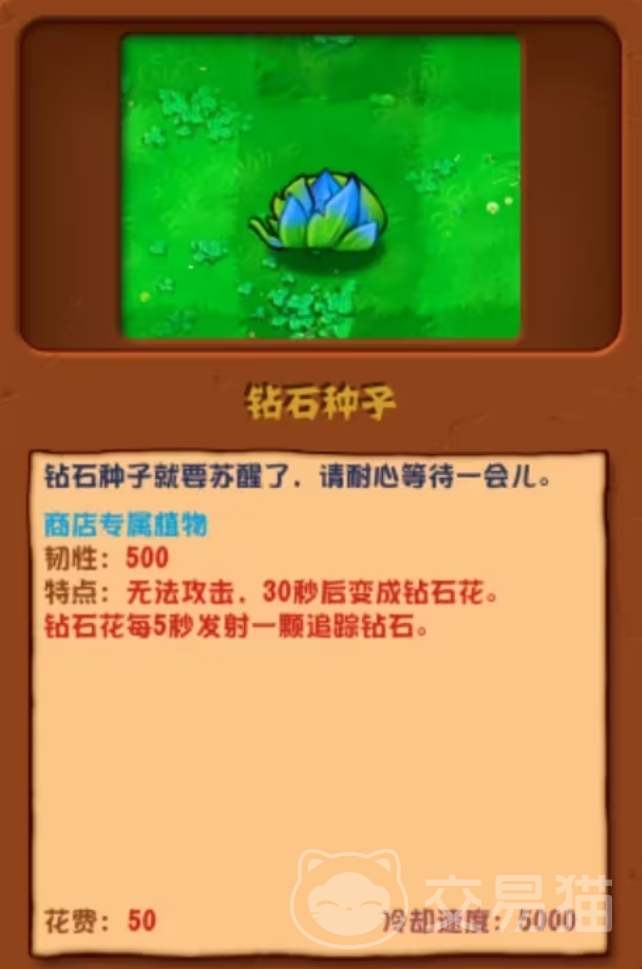 种植后需要经过50秒后才能成长,成长后会发射钻石攻击敌人,虽然说发射间隔长达5秒,但伤害比较高,且该钻石子弹具备着追踪能力,即便不在同一行的僵尸也会遭到攻击。