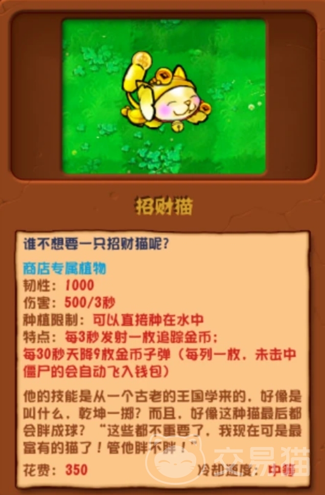 这个植物可直接种植在水中,且具有两种不同的攻击机制。正常状态下招财猫会每3秒发射追踪金币,全图僵尸都会是它的攻击目标。特殊攻击为30秒发动一次,会天降9枚金币且每列一定有一枚,若金币没中僵尸则会被回收。