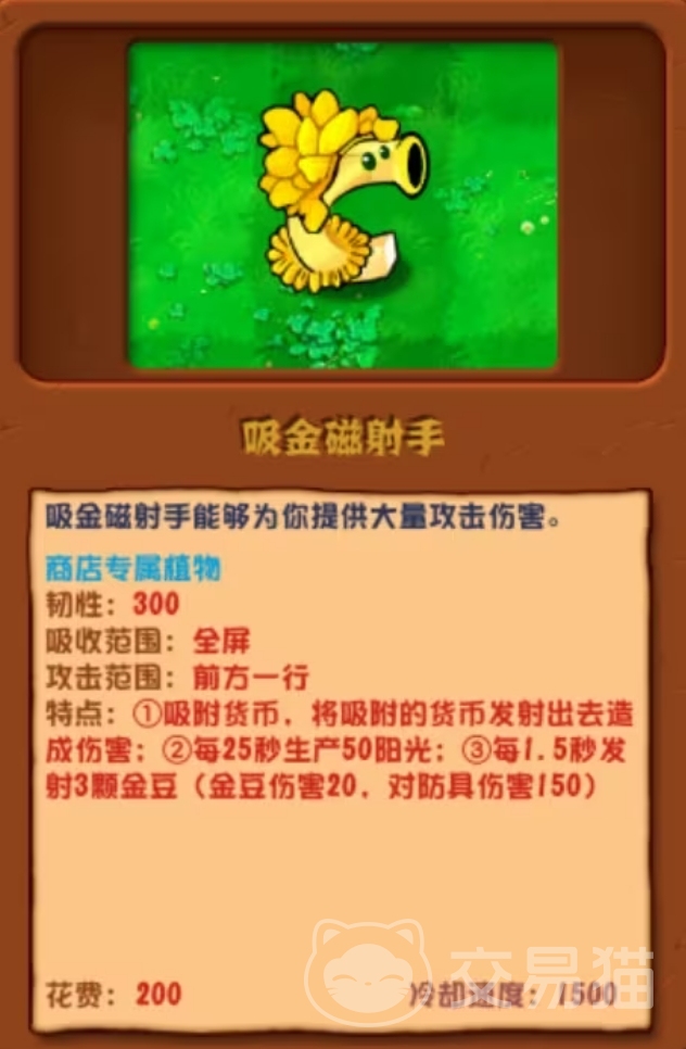 该植物是攻击范围为前方一行的豌豆类植物,能吸附场上的货币并将货币发射出去,且具有生产阳光的能力,所打出的特殊金豆为对防具特化,对僵尸本体的伤害并不高。