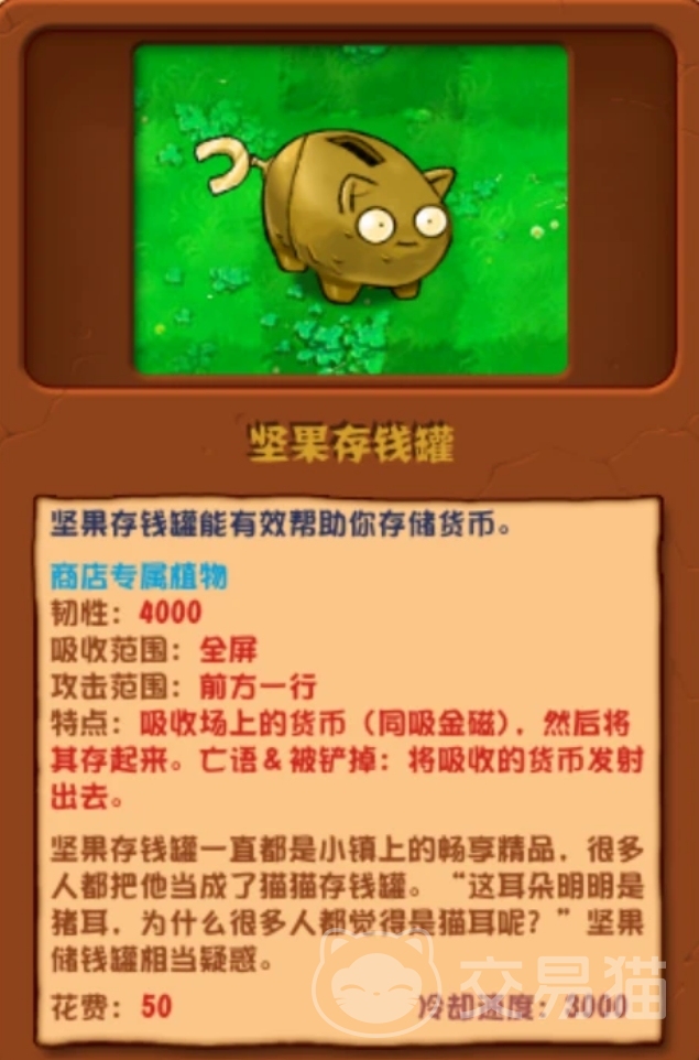 坚果存钱罐在效果上吸金磁差不多,都可自动为玩家收集场上的所有货币,不同的是在它被铲掉或被消灭后,所存储的货币会被直接发射出去,造成较大的伤害,种植所需的阳光为50。