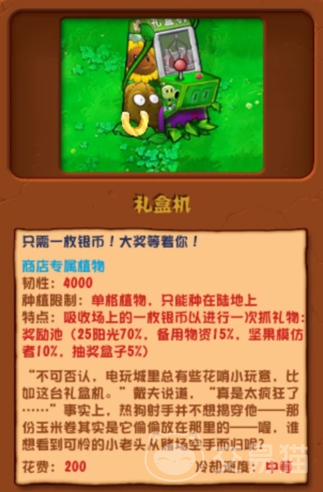 礼盒机是一个极具趣味的商店道具,就如同现实中的抽娃娃机一样,它可收集场上掉落的货币,将为玩家抽取奖项。目前能从礼物机中抽到的东西有阳光、备用物资、坚果模仿者和抽奖盒子。