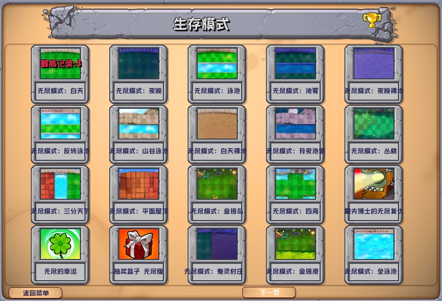 在杂交版的主界面中,玩家只需选择游戏自带的生存模式,就能看到杂交版所提供的全部无尽模式了。所有的无尽模式都按照不同的地形地图进行了区分,有部分无尽地图在地形上延续了原版的经典,例如白天、屋顶等,而有一些则是杂交版自带的地形,例如三分天下,四海等。