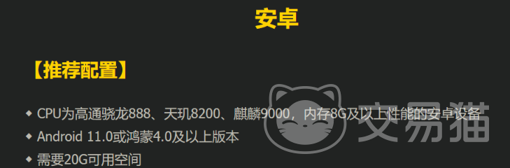 首先来看最低手机配置要去,安卓端的话需要至少骁龙855或者同级别的其他处理器,运存方面需要8GB及以上,然后存储空间方面需要预留至少20GB的空间,这也是考虑到游戏未来版本更新。
