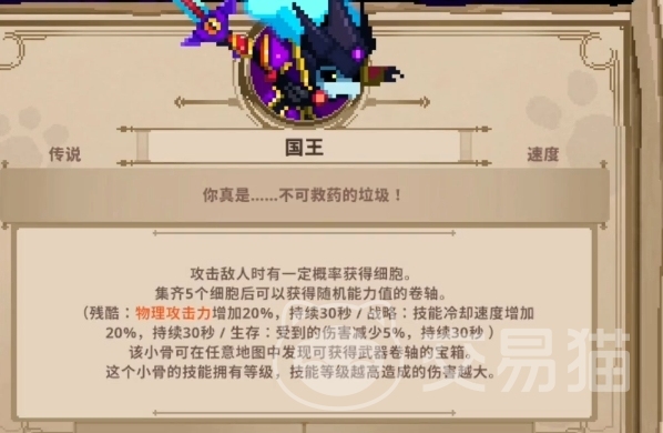 首先需要理解国王自带的技能,之后才能给它装配更适合的精华,道具和黑暗技能,它的技能效果是集齐五个细胞后可以获得随机能力值的卷轴,残酷卷轴可以提升20%攻击力,战略卷轴可以加快技能20%冷却速度,生存卷轴则是减少5%伤害。