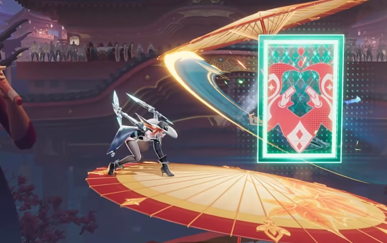 角色还有一个三技能,名为魅盗天降,使用这个技能之后,玩家就可以快速向上跳跃,在下落的时候会直接把敌人束缚住并且进入到隐身的状态,当然还有一个最重要的破晓技就是千面牌阵,使用这个技能之后玩,玩家会直接把手里的卡牌向四周扩散,每一张卡牌都会对敌人造成伤害。